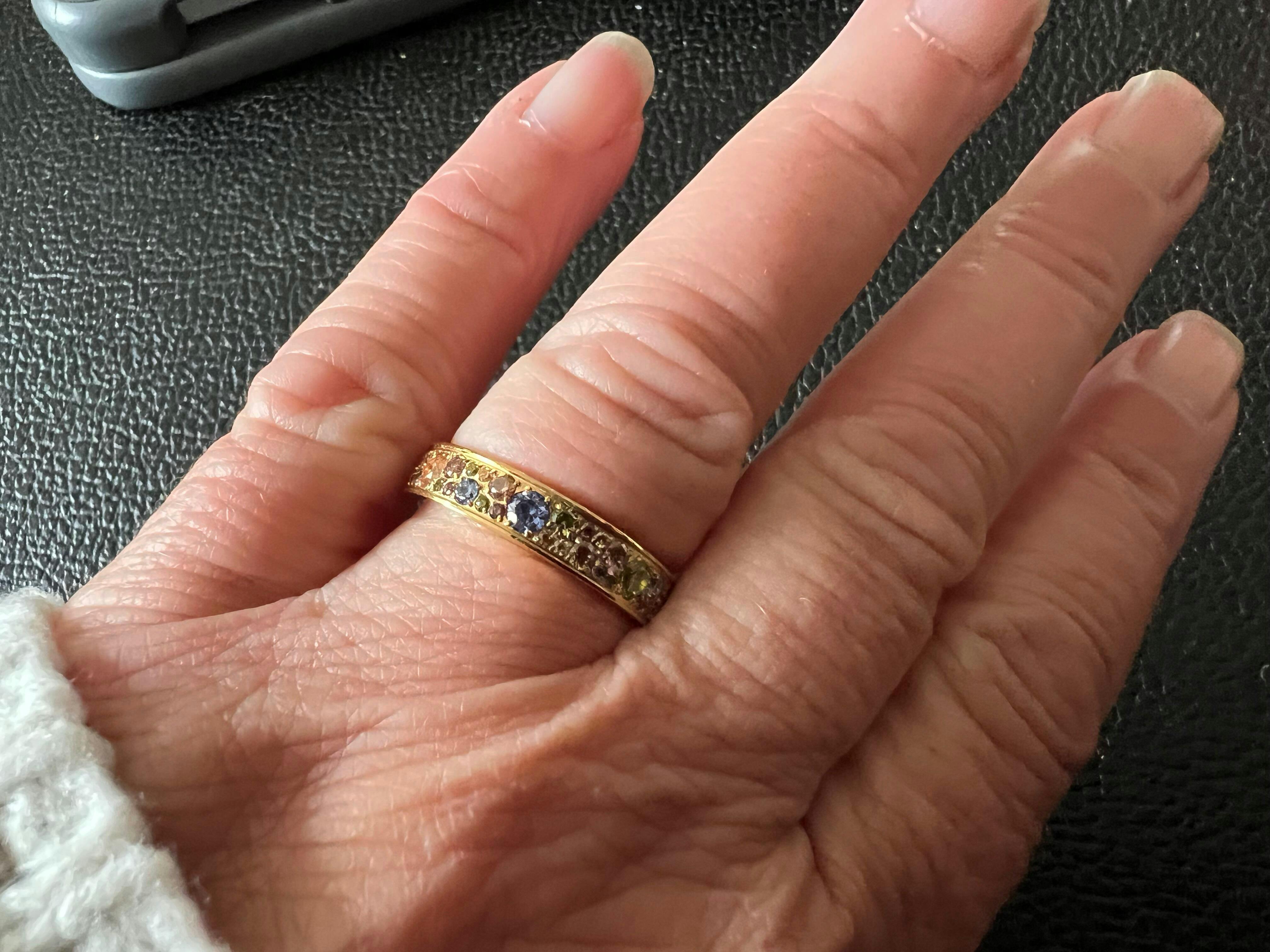 Virkelig fin ring der kombinerer nogle dejlige farver i et harmonisk udtryk. Den er smukkere i virkeligheden end på billederne.